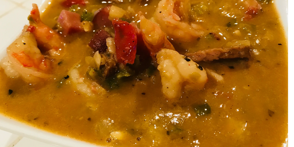 Dirty rice - bell-pepper, onions, tomatoes, parsley, ground chicken andouille, 12.95 / person (min 10 )